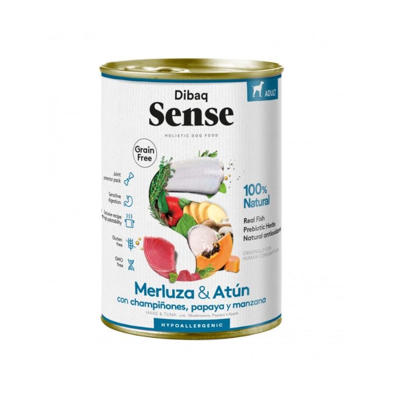 Lata de comida húmeda hipoalergénica para perros de todas las razas y tamaños. Compuesta de Merluza y Atún con champiñones, papaya y manzana.