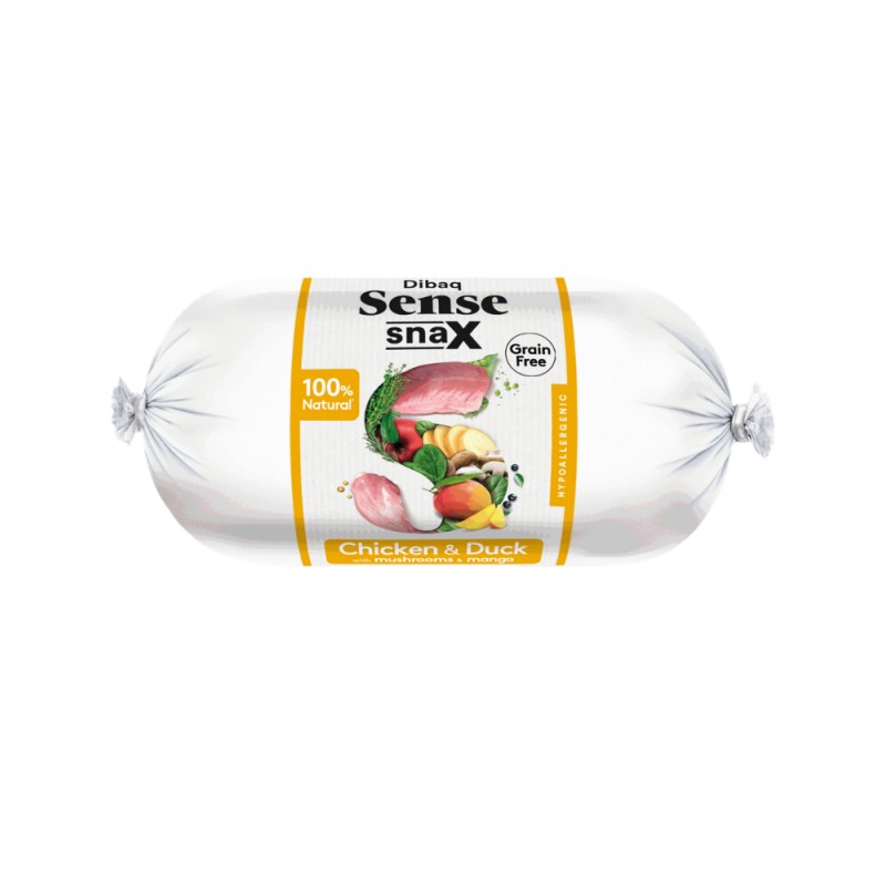 Deliciosos Premios hipoalergénicos 100% naturales de Dibaq Sense. Elaborados con más 74% de carnes frescas, frutas y verduras frescas y protectores articulares. El snax natural más jugoso con ese aporte extra para las articulaciones de la mascota.