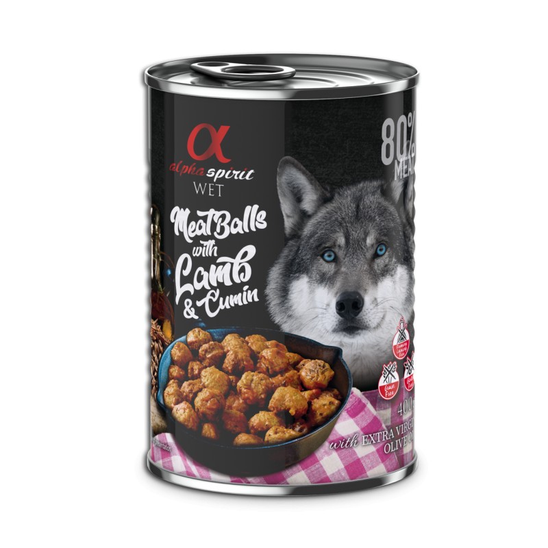 Composición: Carne 80% (carne de pollo 70%, carne de cordero 10%), almidón de patata, proteína de guisante, comino (0,1%), minerales, aceite de oliva virgen extra.