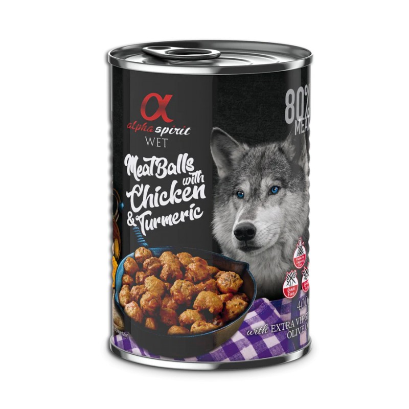 Carne de pollo 80%, almidón de patata, proteína de guisante, cúrcuma (0,1%), minerales, aceite de oliva virgen extra.