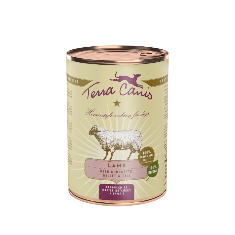 Composición: Corazón de cordero (35%), zanahoria, calabacín (13%), pulmón de cordero (11%), mijo (8%), manzana, apio, aceite de linaza, polvo de cáscara de huevo, levadura de cerveza, albahaca, eneldo (0,2%), hinojo semilla, algas (0,13%), arcilla mineral, polen Proporción: Carne: verduras / frutas / hierbas: mijo: otras materias primas = 46%: 44%: 8%: 2%