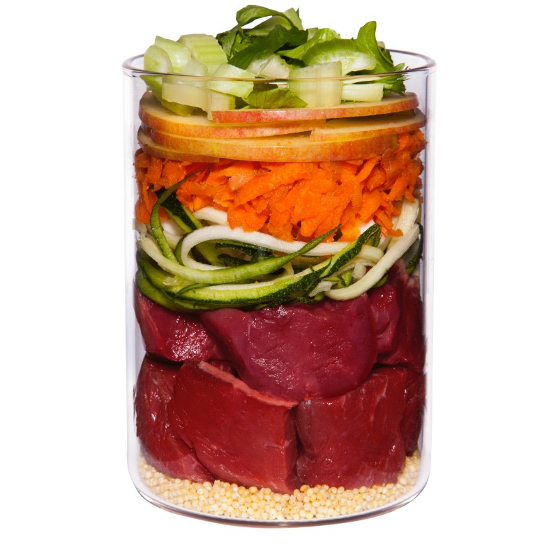 Los menús de Terra Canis CLASSIC se componen de una alta proporción de carne de músculo (esto incluye la carne de músculo clásica, así como el corazón y el estómago, que son órganos musculosos huecos), una baja proporción de hígado rico en nutrientes y muchas verduras frescas y saludables, fruta. y hierbas.