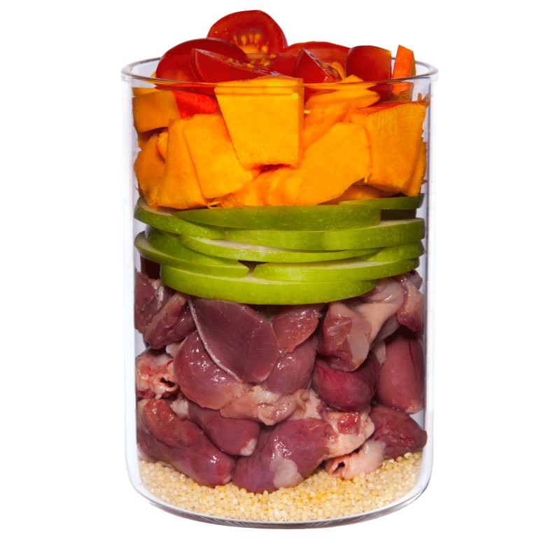 Composición: Corazón de pollo (34%), estómago de pollo (14%), calabaza (14%), mijo, manzana, tomate, carne de pollo (6%), hígado de pollo (4%), aceite de linaza, harina de semilla de calabaza (1%) ), polvo de cáscara de huevo, levadura de cerveza, algas *, cebollino, manzanilla (0,2%), tierra de diatomeas, polvo de rosa mosqueta *, arcilla mineral, polen * * seco.