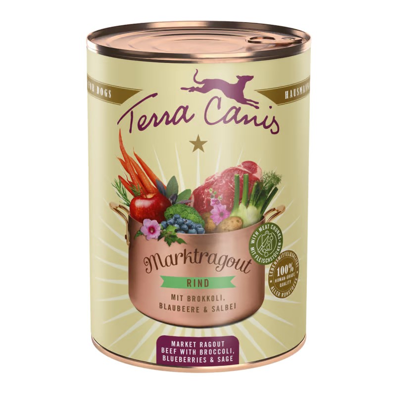 Carne de músculo de corazón de buey (43%), carne de músculo de buey (carne para estofado) (16%), zanahoria (11%), patata (9%), brócoli (4%), remolacha*, batata, manzana, hinojo (2%), arándano azul (0,5 %), aceite de colza, coco rallado, levadura de cerveza*, concha de ostra*, salvia* (0,1%), estragón* (0,1%), hibisco (0,1%), perifollo* (0,1%), sésamo*, arcilla mineral*, sal andina, algas*, minerales * seco