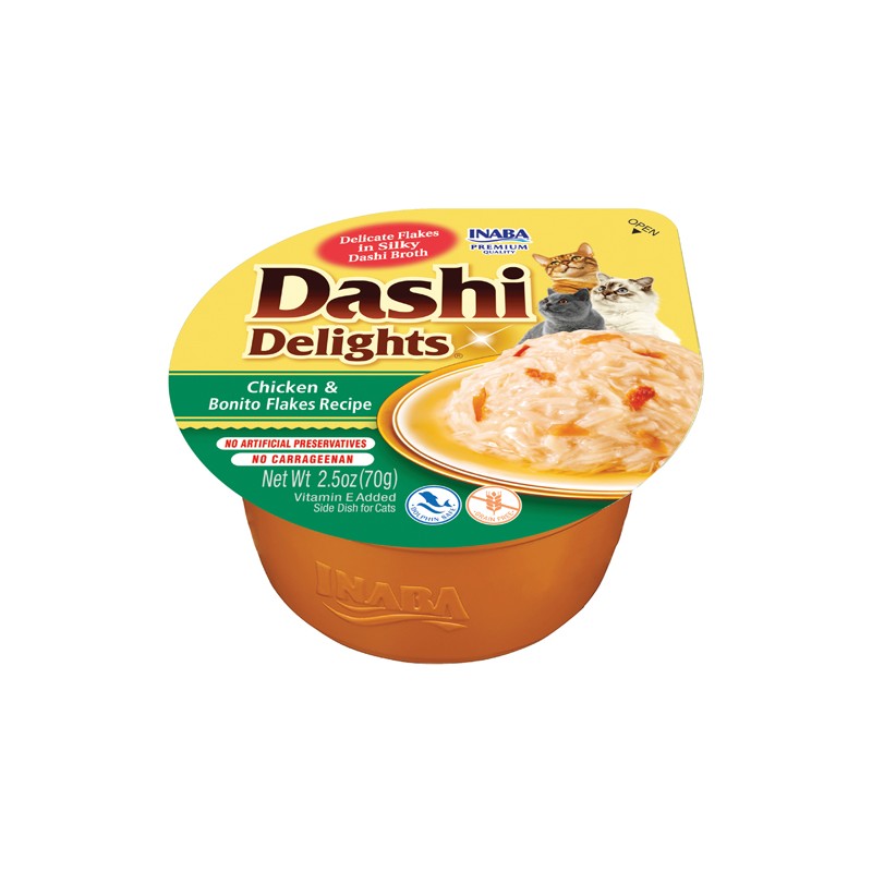 Dashi es un caldo de pescado tradicional japonés a base de hojuelas de atún listado, famoso por su rico y expresivo gusto. Es un manjar único con alta humedad, rico en proteína animal, sin cereales, aditivos indeseables e ingredientes artificiales. Dashi Delights de INABA hará que cada comida sea deliciosa excepcional. ¡Hidratante, nutritiva y siempre deliciosa!