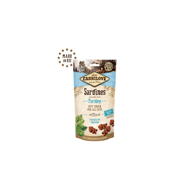 Snack semihúmedo de sardinas con perejil, lo que ayuda a una digestión saludable. Rico en proteínas y sin colorantes artificiales.