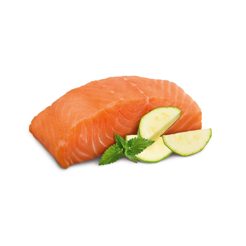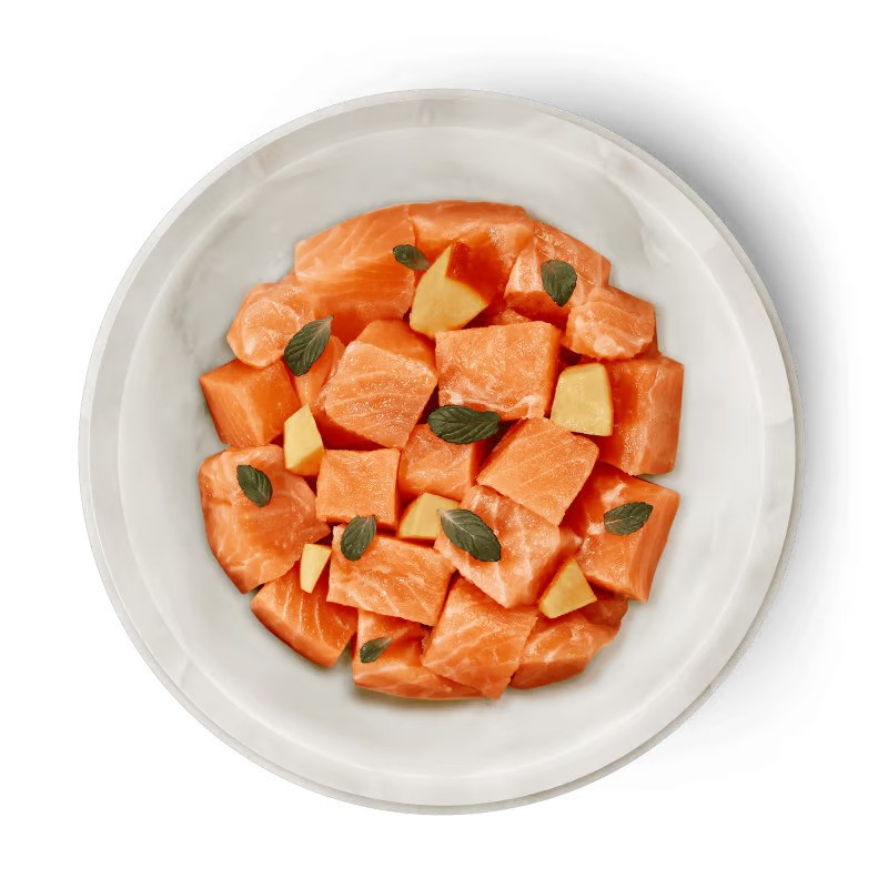 Filete de salmón (90 %), calabacín (4 %), tomate en polvo, hierba gatera* *ingrediente seco