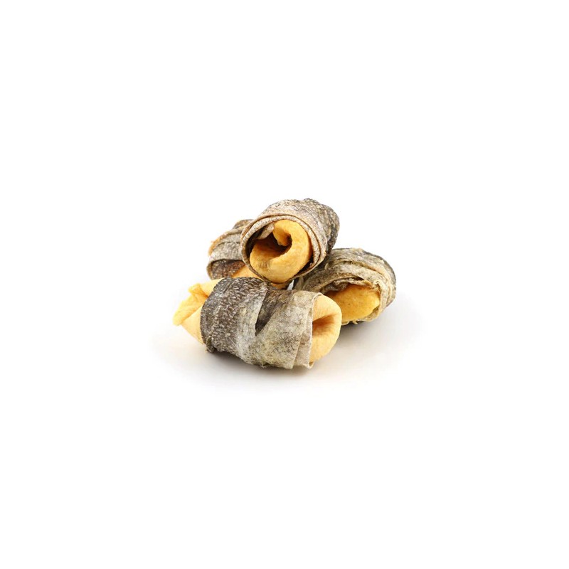 Premios realizados con piel de pescado secada al horno, gracias a esta técnica se consigue un premio saludable con el mínimo de calorías. Además y debido a su dureza estos bocaditos ayudaran a mantener una correcta salud dental.