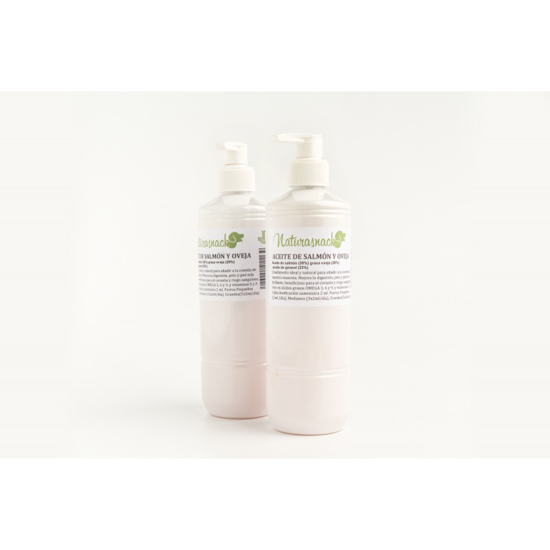 El aceite de salmón y oveja es el condimento ideal y natural para añadir a la comida de nuestros perros.