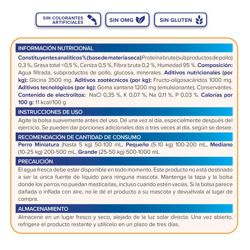 Agua filtrada, subproductos de pollo, glucosa, minerales.