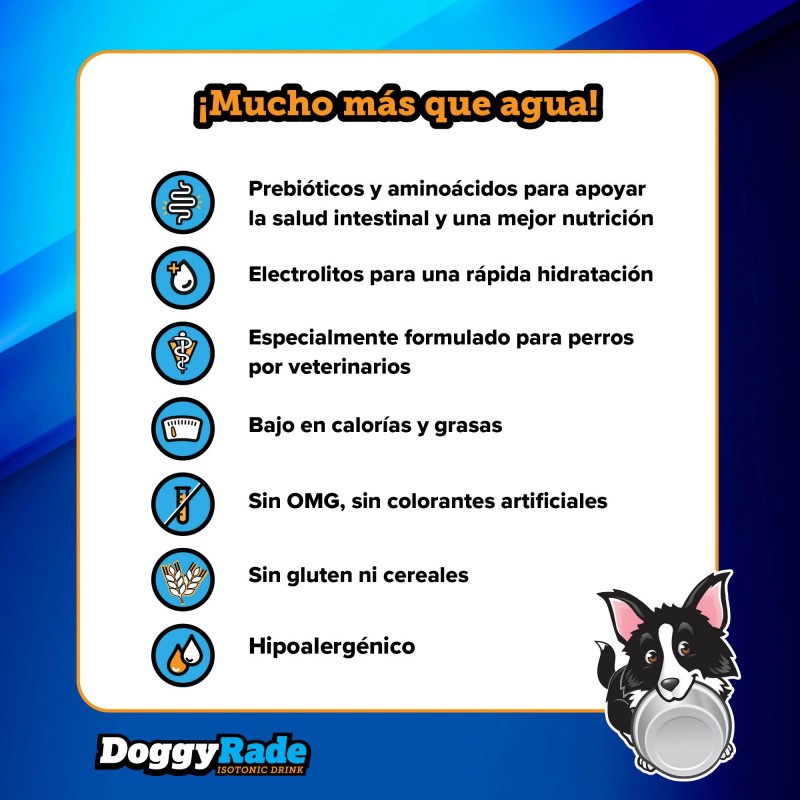 DoggyRade es una bebida isotónica que ayuda a los perros a hidratarse rápidamente después del ejercicio. Además de ser delicioso, contiene electrolitos esenciales y prebióticos que favorecen la salud intestinal y la absorción de nutrientes. Sin OMG, sin gluten y bajo en calorías, es apto para todos los perros. Ha sido formulado por veterinarios para promover la hidratación, la salud y el bienestar. Almacene sin abrir en un lugar fresco y seco y refrigere una vez abierto.